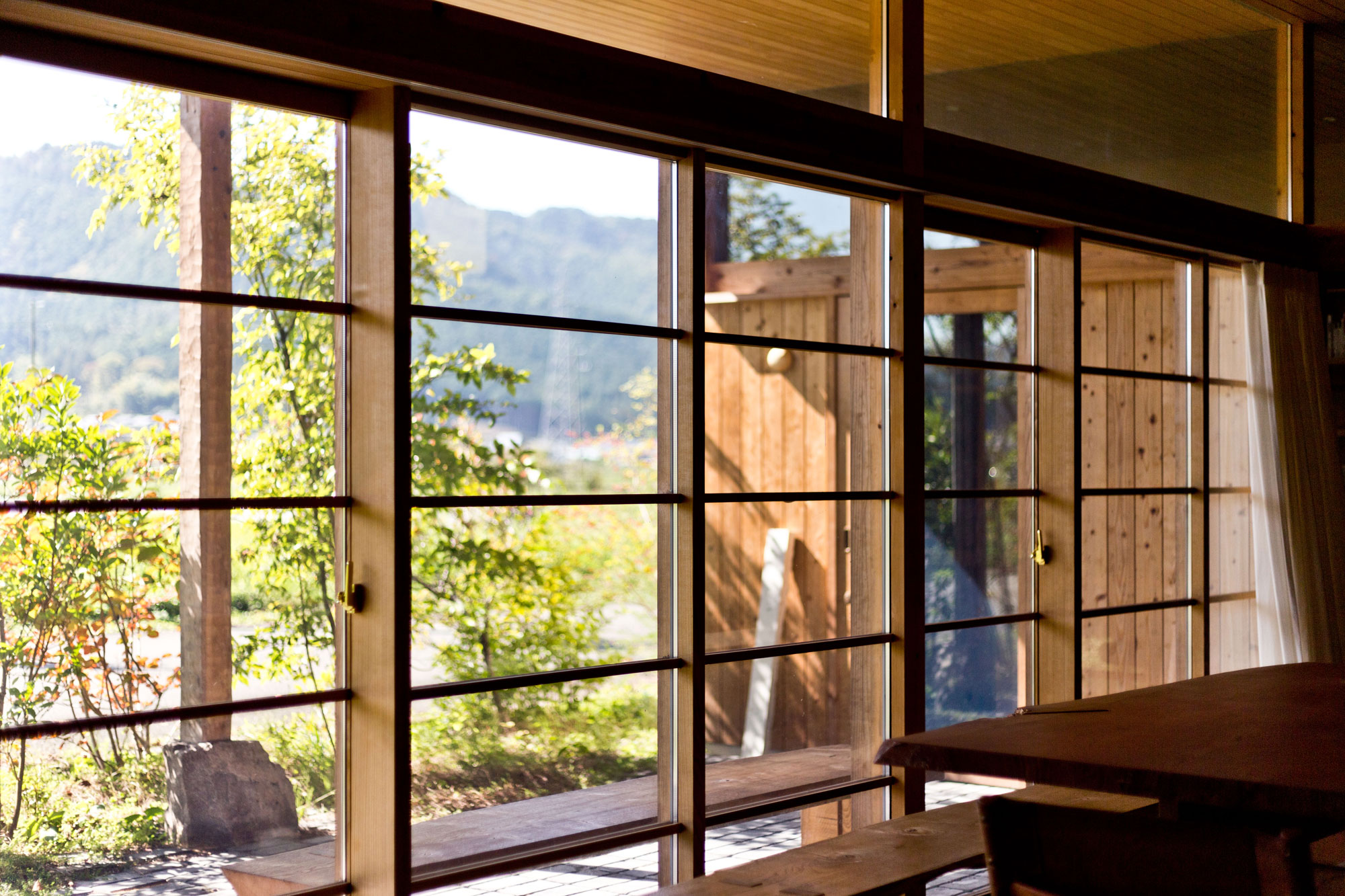 裏山から伐採したヒノキの構造材、県産中心の造作材、瓦を焼く窯で焼き直した床の再生レンガ、播州織のカーテンと扉の張地、粗壁土の壁、そして断熱材や防水紙に至るまで、周りを見渡せばその向こうに沢山の人の顔やその素材が育まれた景色が日々見えて来ます。