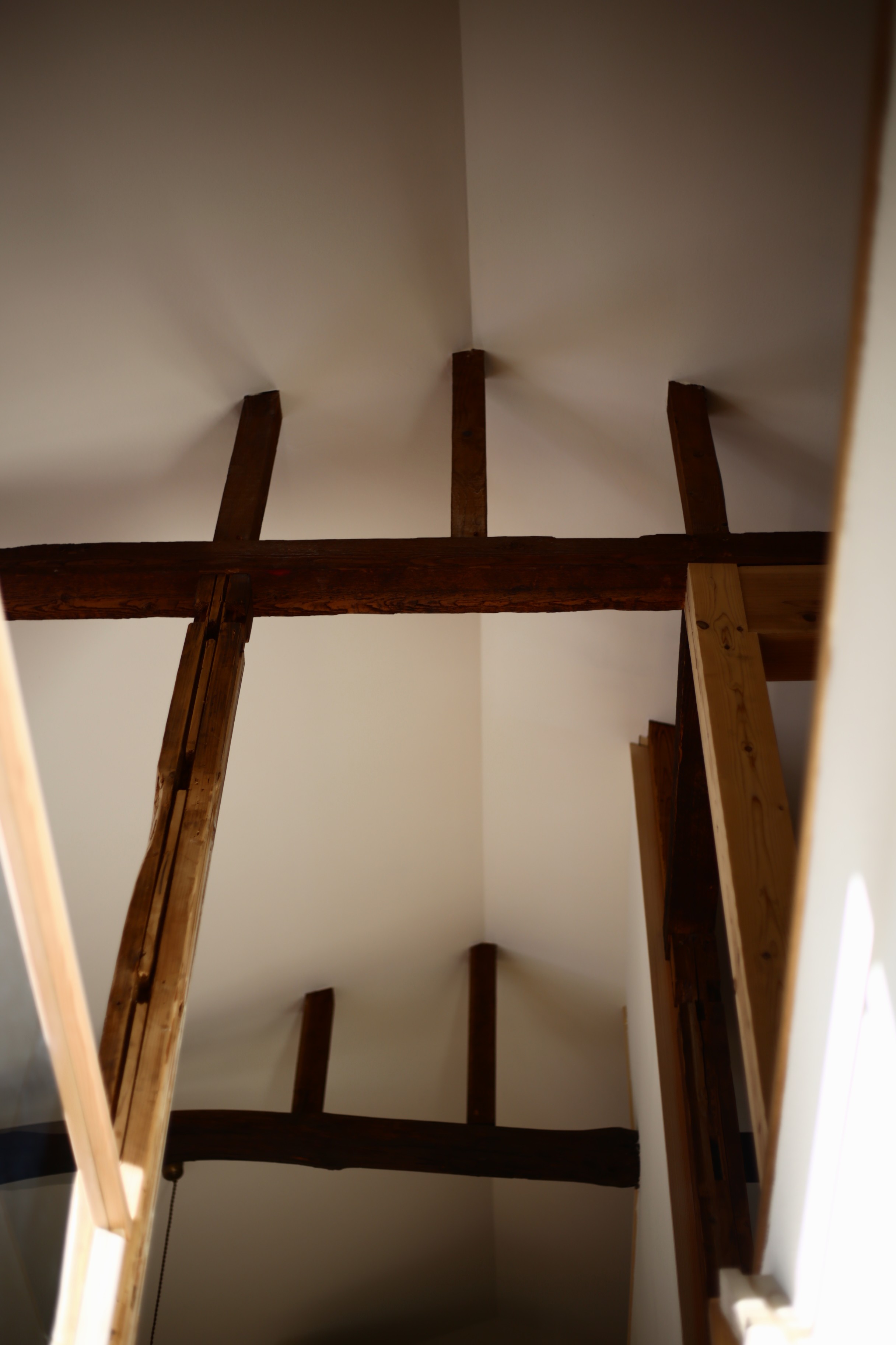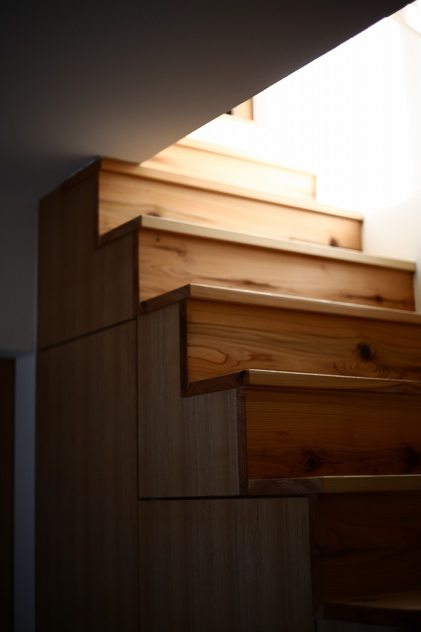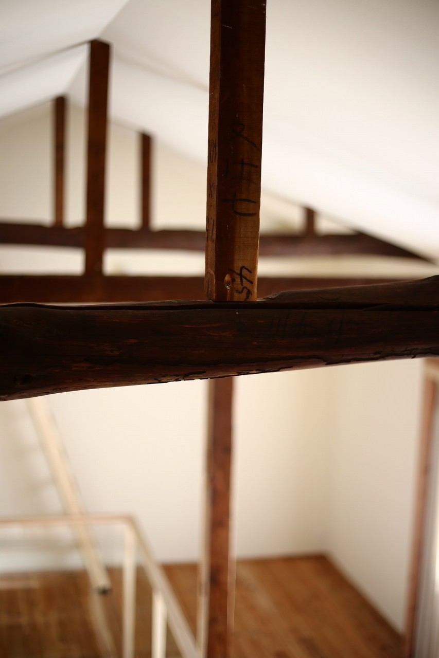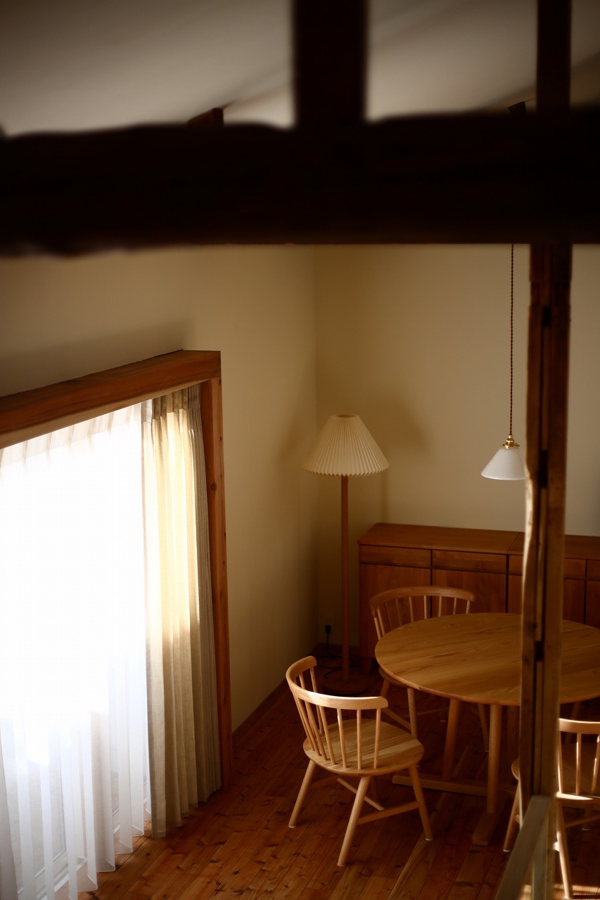 かつての「1階が店舗、2階が住居」という構成を読み解き直し、1階を「家族や来客を優しく迎えるパブリックな場」として再編集しました。 構造材をあえて見せ、杉の無垢床に漆喰の壁を合わせることで、建物の新旧の記憶を馴染ませています。